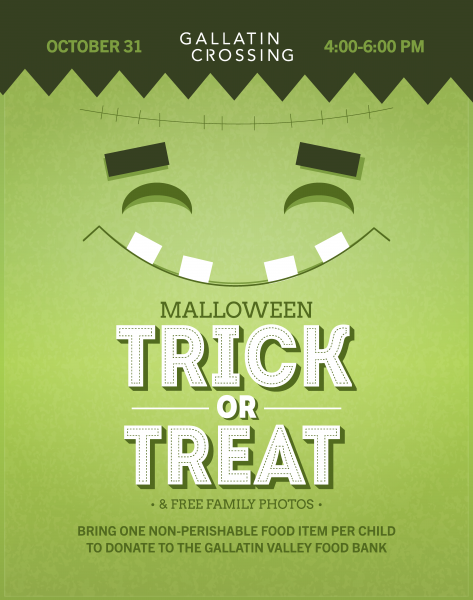 Get ready for a spooktacular evening at Gallatin Crossing’s Malloween Trick-or-Treat! Bring your little ghosts and goblins to Gallatin Crossing on Halloween, October 31st, from 4:00 PM to 6:00 PM, for a safe and fun-filled trick-or-treating experience. Kids can enjoy collecting candy from store to store in a festive indoor setting—rain or shine!