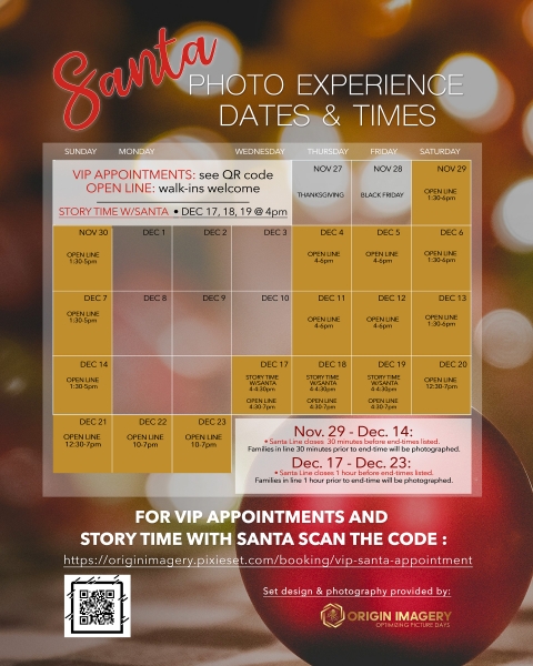 Santa Claus is coming to town! He will be in his classic red suit with bells on and candy canes in hand. Both walk-in times and VIP appointments are available. See the schedule below and be sure to follow Origin Imagery - Facebook and @origin_imagery_llc - Instagram for more info including Story Time with Santa the week of December 17th!